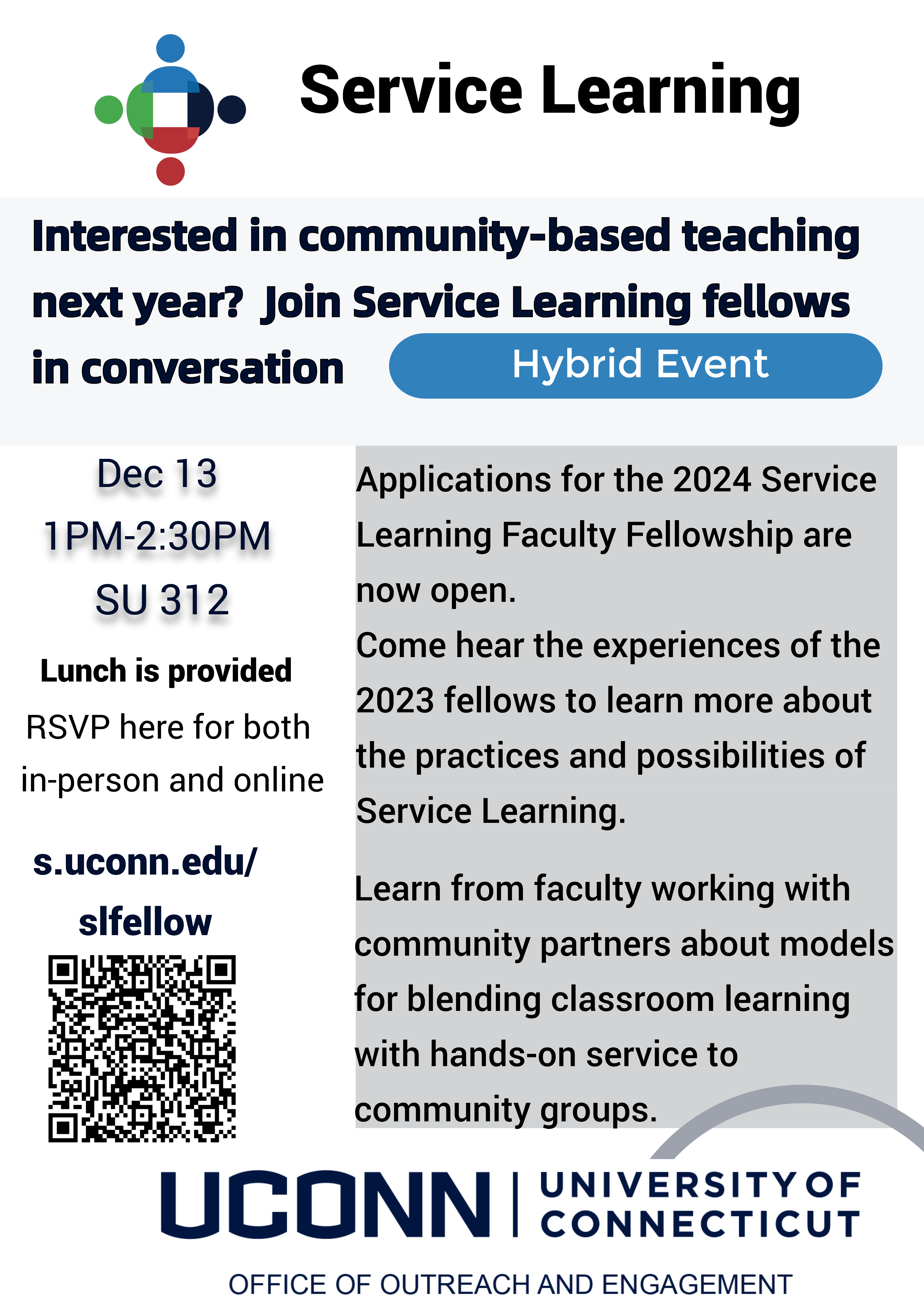 We are pleased to support UConn’s commitment to Life Transformative Education by offering a full-year fellowship opportunity to faculty interested in teaching Service Learning courses. Service Learning is a long-established UConn pedagogical practice that works with community partners to combine classroom learning with hands-on service in the community. Fellows meet on Fridays during the spring semester to train in SL methods and individually with SL faculty mentors to develop reciprocal community partnerships and adapt syllabi based on their partnership. Fellows then launch their courses in the summer, fall, or the following spring and continue to meet 4x in the fall to discuss progress and challenges.